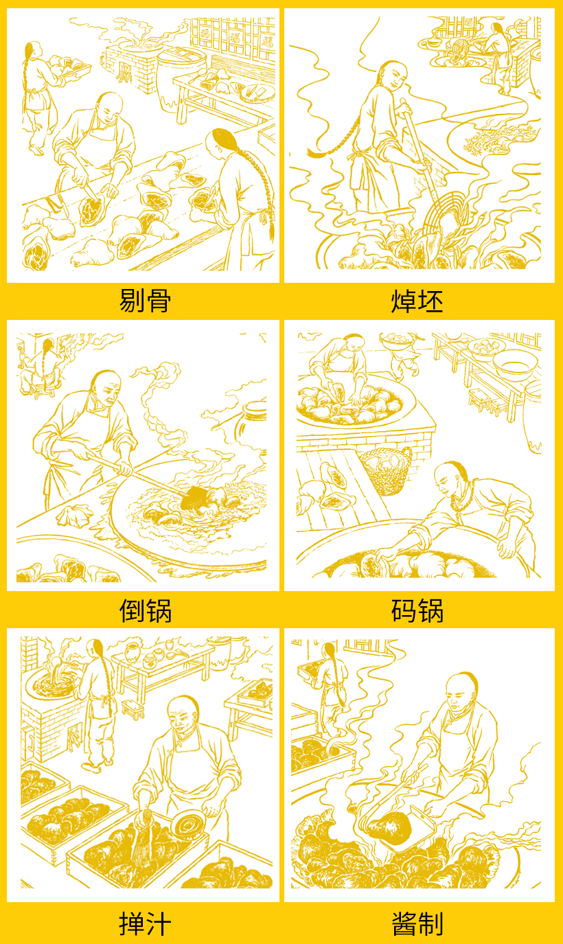 天福號醬肘子制作經過剔骨、焯坯、倒鍋、碼鍋、醬制、撣汁等多道工序,過程煩瑣,僅醬制就需五六個小時,其間尤其講究人工對火候、時間的把握,只有15年以上從業者才能獨立操作。其制作技藝因“選料至精、工序繁瑣、工藝復雜、工具繁多”等特點納入《國家級非物質文化遺產》保護名錄。
